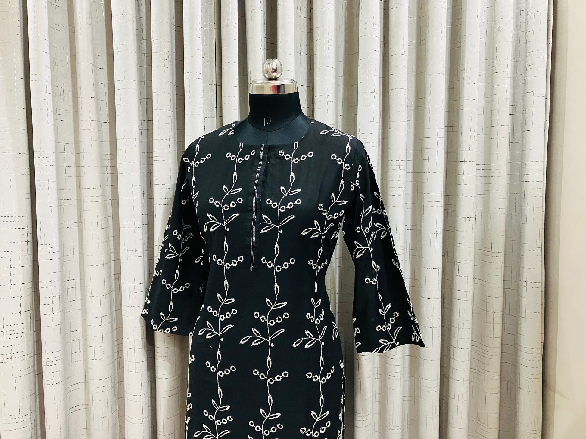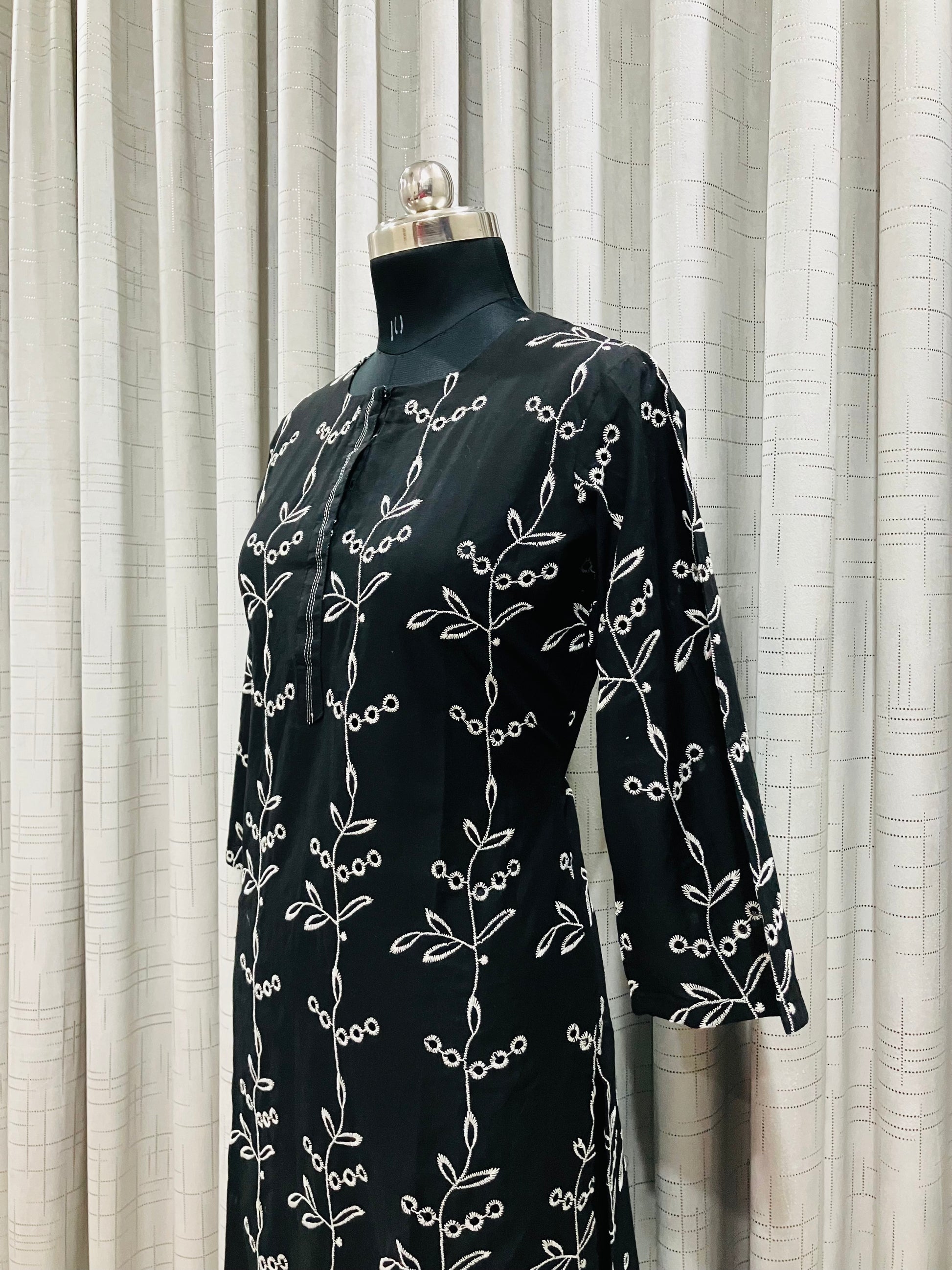 Add elegance to your everyday style with this classic black kurti featuring delicate white thread embroidery in a nature-inspired pattern. Paired with crisp white straight pants, this set is perfect for a graceful yet comfortable look.