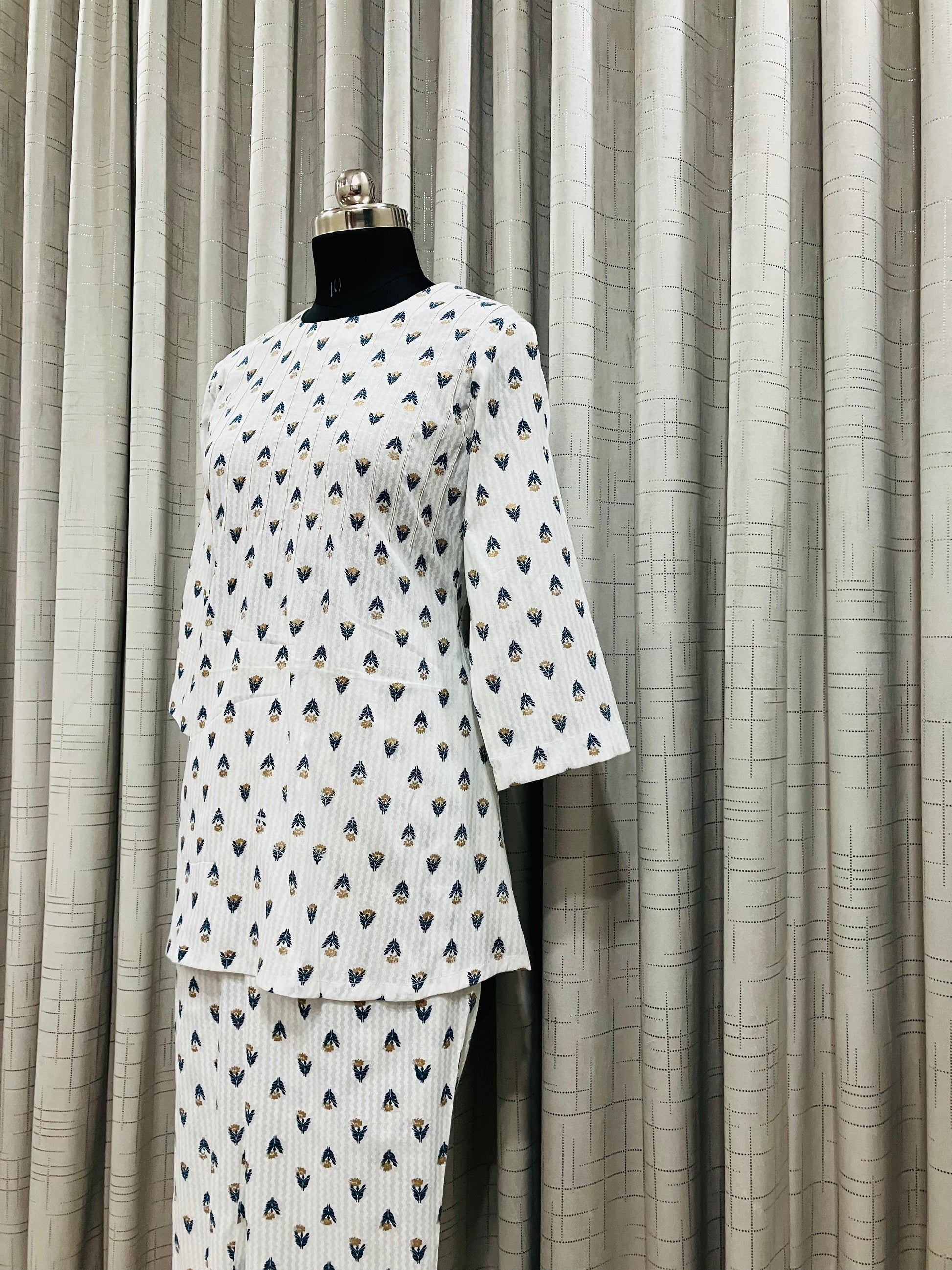 Stay stylish and comfortable with this elegant white co-ord set featuring a subtle geometric print. Made from soft, breathable cotton, it includes a straight-fit top with elbow-length sleeves and a matching straight-cut bottom. Perfect for casual outings, travel, or relaxed office wear.